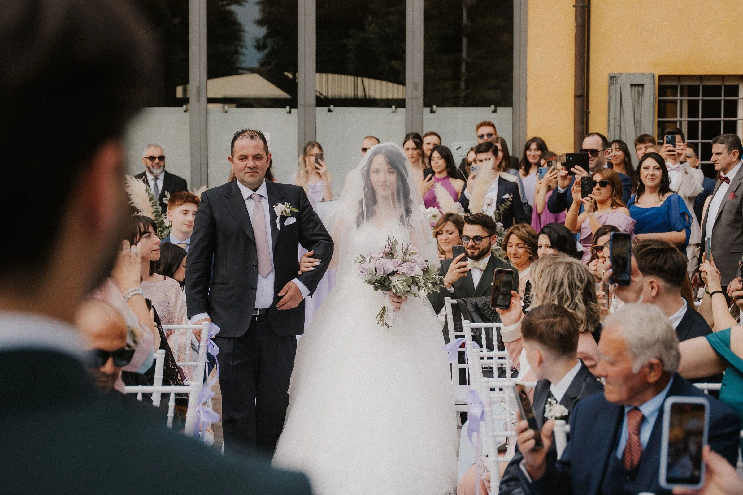 Their wedding day was everything they dreamed of: simple, genuine, and filled with emotion. The intimate outdoor ceremony took place in the peaceful gardens of Corte dei Melograni, with close family and friends gathered to witness their vows under the open sky.
